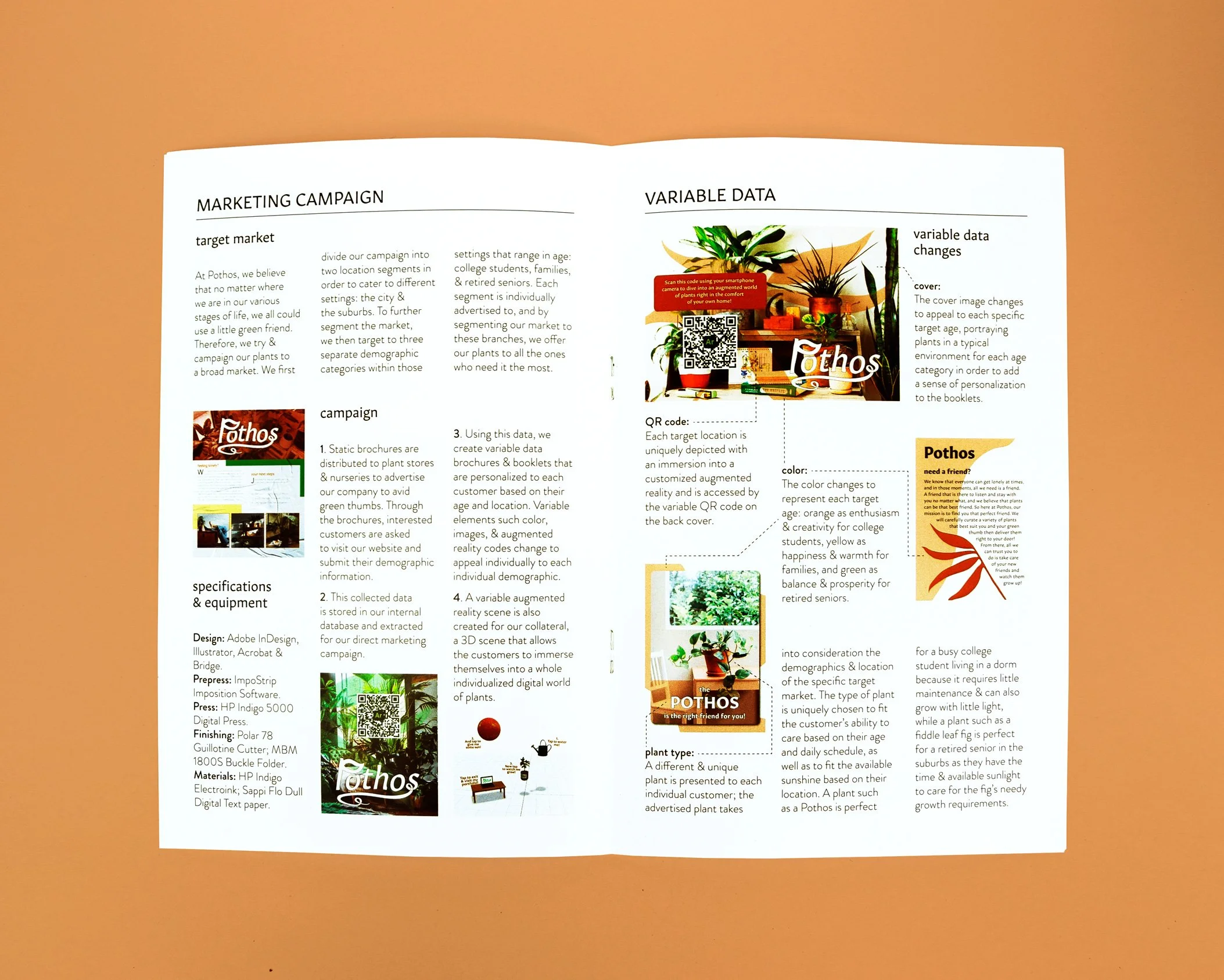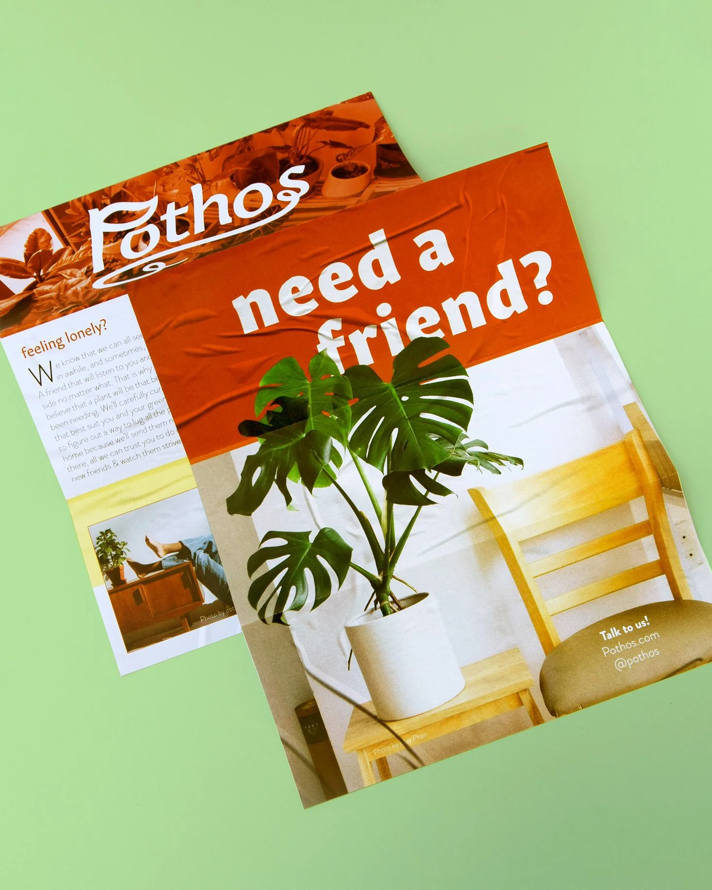 No person's lifestyle is the same. At the same time, no plant is the same. Pothos knew that well, and therefore made it a promise to complement every individual with the perfect plant. After interested customers helped paint a picture of their lifestyle through a digital survey, Pothos produced personalized booklets that paired flora to the customer's specific demographic and location. This ensured that each customer was delivered a green friend that best fit within their home and ability of care.